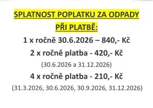 poplatek za odvoz odpadů ve výši 840,- Kč za osobu je třeba uhradit do 30.6.2026.