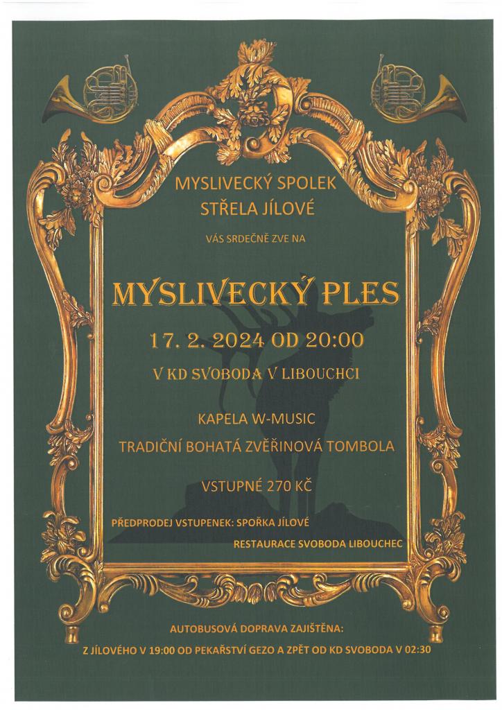 Myslivecký spolek Střela Jílové Vás srdečně zve na Myslivecký ples, který se bude konat dne 17.2.2024 od 20.00 hodin v KD Svoboda v Libouchci.