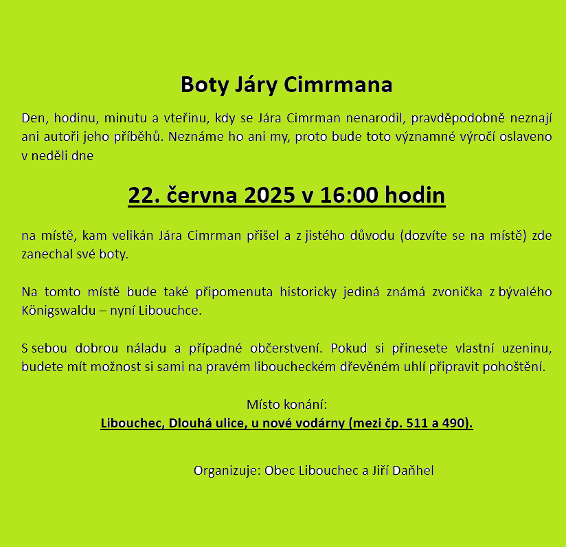 Jiří Daňhel a obec Libouchec Vás srdečně zvou na slavnostní odhalení nového památníku Járy Cimrmana a obnovené repliky bývalé zvoničky.