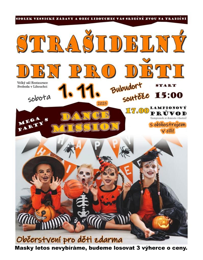 Jako vždy dostanou děti balíček, párek v rohlíku a nebude chybět ani skvělý Bubudort od ČaroDášenky. Startujeme v 15 hodin na sále DK Svoboda se super partičkou Dance Mission, která má připravené parádní soutěže. Zhruba v 16,45 h. se pomalu přesuneme ven, kde zapálíme lampionky (každý si musí přinést svůj) a vydáme se tajemný průvod. Ten zakončíme tajemným ohňostrojem u koupaliště (u sportovní haly).