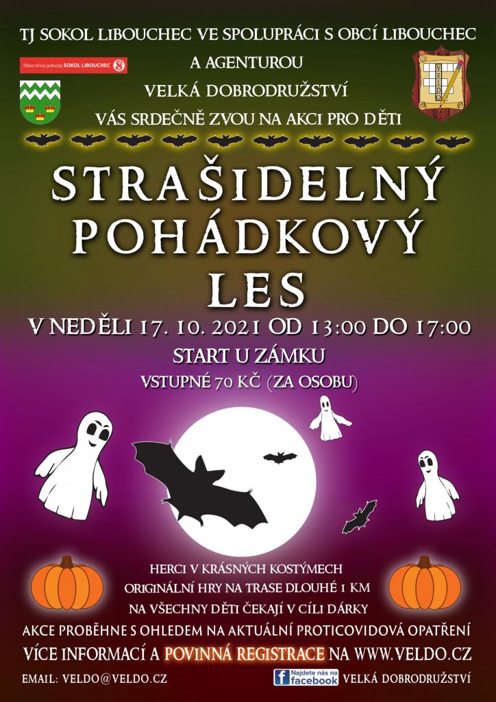T.J.Sokol Libouchec ve spolupráci s agenturou Velká dobrodružství Vás zvou na akci Strašidelný pohádkový les. Akce proběhne v neděli 17.10.2021 v okolí zámku Libouchec. Informace a povinná registrace na www.veldo.cz (email: veldo@veldo.cz)